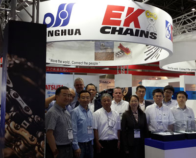 本屆展會上,東華集團聯合展出了中國、德國和日本三個生產基地制造的各種標準鏈、農機鏈、齒形鏈、鋼廠輸送鏈、扶梯鏈、散物料輸送鏈、汽車工業鏈、食品工業鏈、木材加工鏈、污水處理設備鏈、加工中心刀庫鏈、焊接彎板鏈,帶密封圈的摩托車鏈條等公司優勢產品,吸引了來自全球絡繹不絕的客戶參觀與洽談。集團總工程師葉斌、副總經理馬愛華、國際貿易部王偉強處長和業務員在現場熱情地接待了來自全球的新老客戶。