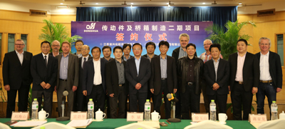 簽約儀式上,董事長宣碧華致辭。他說,東華2007年收購興化齒輪廠,至今已有8年,一直得到了興化市委、市政府和興化開發(fā)區(qū)的大力支持,使一個當時不太景氣的企業(yè),得到了新生、發(fā)展。現(xiàn)在不僅是鏈條行業(yè),齒輪、鏈輪、變速箱、橋箱將同步發(fā)展。今天簽約的興化這個項目,我們考慮了東華發(fā)展的增量和存量。增量是我們希望到2020年生產(chǎn)總量翻一番,興化的這個土地就是我們的增量空間。存量有兩塊,一是原來我們在外采購的原材料、零部件,拿回來放在興化生產(chǎn),保證質(zhì)量;二是現(xiàn)在臨平三廠區(qū)制造鏈條要退二進三,騰籠換鳥,把騰出來的廠房做新的項目,比如傳動件超市、輸送機械、CVT變速箱,所以今天我們在這兒舉行簽約儀式,對東華來講是一個很好的發(fā)展機會,具有里程碑意義。