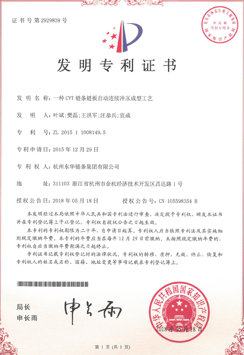 另,2019年12月,集團知識產(chǎn)權(quán)管理體系順利通過中知(北京)認(rèn)證有限公司的年度監(jiān)督審核,進一步證實了集團公司知識產(chǎn)權(quán)管理體系運行有效性。同時,《2019年度浙江省專利項目績效評價(專利獎)結(jié)果公示》,集團公司“一種CVT鏈條鏈板自動連續(xù)沖壓成型工藝”發(fā)明專利榮獲浙江省專利優(yōu)秀獎。