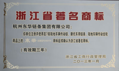 日前,東華集團(tuán)注冊(cè)并使用在7類陸地車輛傳動(dòng)鏈、摩托車用鏈條、陸地車輛傳動(dòng)齒輪商品上的“東華”(注冊(cè)證號(hào):943174)商標(biāo)被浙江省工商行政管理局延續(xù)確認(rèn)為浙江省著名商標(biāo),有效期三年。這是2004年 “東華”商標(biāo)被認(rèn)定為浙江省著名商標(biāo)后連續(xù)被延續(xù)確認(rèn)。