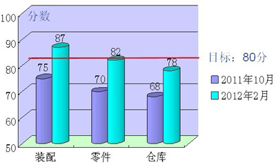 樣板先行,整體推進(jìn)  事業(yè)部從實(shí)際出發(fā),確立“樣板先行、整體推進(jìn)”方針,做到以點(diǎn)帶面、全面推進(jìn)、激勵(lì)到位。在推行5S、TPS 活動(dòng)的第一階段,我們確定了專機(jī)班為樣板,之后擴(kuò)大到總成班、倉(cāng)庫(kù)等,通過樣板區(qū)域的改善實(shí)例,教育引導(dǎo)事業(yè)部其它班組和區(qū)域的改善。樣板的建立一方面塑造了一個(gè)學(xué)習(xí)參照的對(duì)象,另一方面也激發(fā)了學(xué)、趕、超的氛圍,有效促進(jìn)了整個(gè)事業(yè)部5S、TPS 改進(jìn)活動(dòng)熱情的提升。