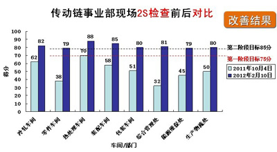 2S管理明顯提高并標準化作業(yè)  通過2S的運行,傳動鏈事業(yè)部員工的現(xiàn)場2S意識和管理都得到了明顯提升,如包裝車間現(xiàn)場管理的雜亂改善到目前的現(xiàn)場流程規(guī)范、通道流暢、物品擺放整齊等,熱處理車間設備運行狀態(tài)可視化等;同時廣大員工學會了總結與標準化操作,如現(xiàn)場檢查標準化、任務改善驗證標準化、管理點檢標準化、現(xiàn)場作業(yè)標準化等。