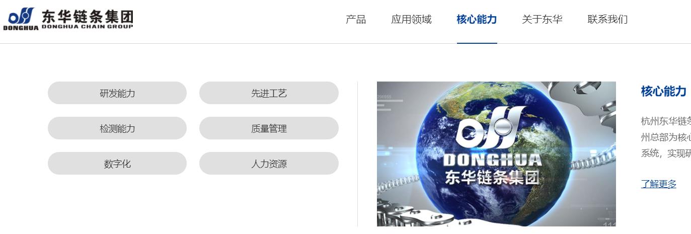 網站包含五大模塊:產品、應用領域、核心能力、關于東華、聯系我們