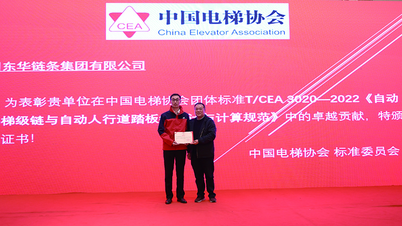 近日,中國電梯協(xié)會(huì)標(biāo)準(zhǔn)委員會(huì)授予東華鏈條集團(tuán)榮譽(yù)證書,以表彰東華在中國電梯團(tuán)體標(biāo)準(zhǔn)T/CEA 3020-2022《自動(dòng)扶梯梯級(jí)鏈與自動(dòng)人行道踏板鏈設(shè)計(jì)與計(jì)算規(guī)范》中的卓越貢獻(xiàn)。東華扶梯工程鏈?zhǔn)聵I(yè)部代表公司出席了頒獎(jiǎng)儀式。