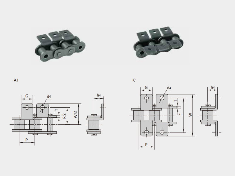 ● 輸送用滾子鏈的附件根據(jù)使用要求設(shè)計(jì)不同的結(jié)構(gòu)形式,具有廣泛性、多樣性等特點(diǎn),其中水平壓彎附板、帶孔直立附板、加長(zhǎng)銷軸等附件應(yīng)用較為廣泛。